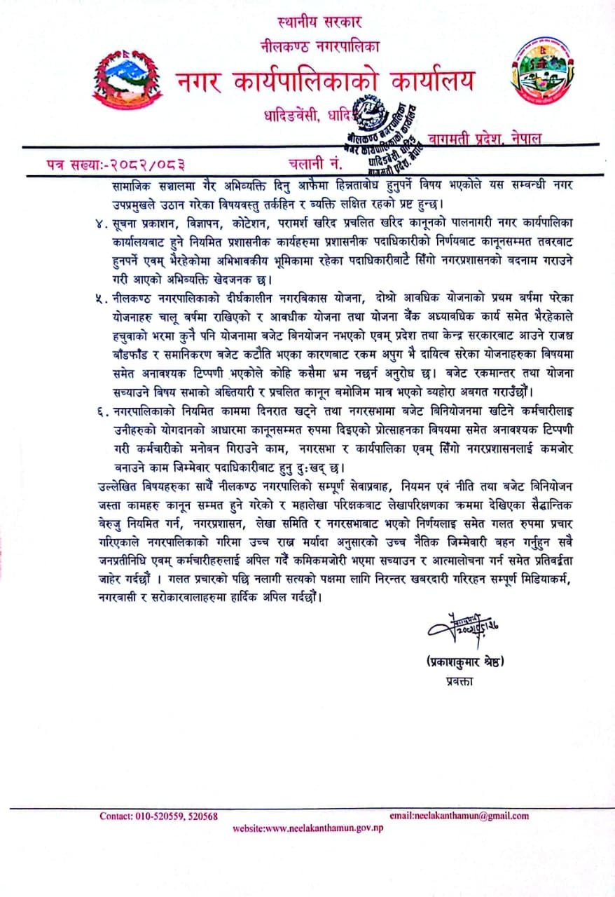 नीलकण्ठ नगरपालिकाले उपप्रमुखबाट असहमति जनाइएको विषयमा सामाजिक सञ्जाल तथा केही अनलाइन सञ्चारमाध्यममा प्रकाशित समाचारप्रति ध्यानाकर्षण भएको जनाएको छ।
