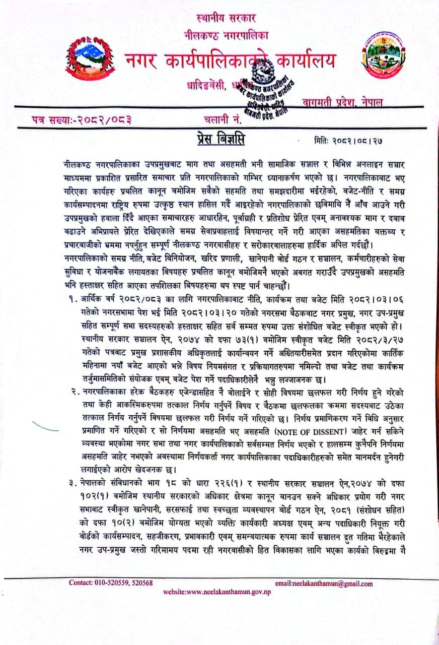 उपप्रमुखको असहमति सम्बन्धी समाचारप्रति नीलकण्ठ नगरपालिकाको स्पष्टिकरण